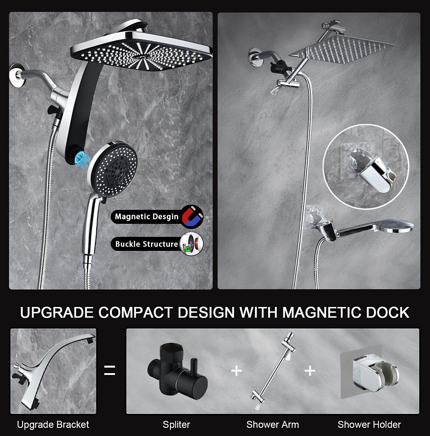- Upgrade technology ensure amazing showering experience, compare with original magnetic shower head, our rain shower head adopts strong metal magnetic combin buckle structure which can hold your handheld shower head firmly (Patent NO:US011857983B2 & US12269049B1)