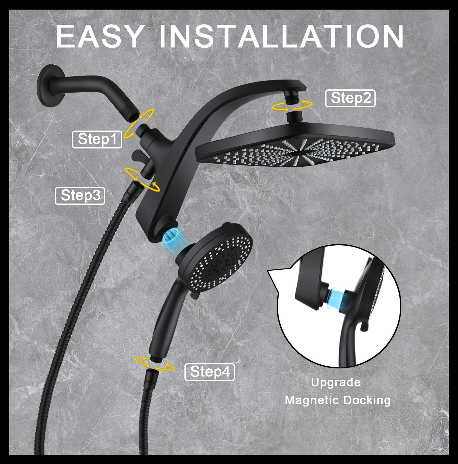 • Upgrade technology ensure amazing showering experience, compare with original magnetic shower head, our rain shower head adopts strong metal magnetic combin buckle structure which can hold your handheld shower head firmly (Patent NO:US011857983B2 & US12269049B1)