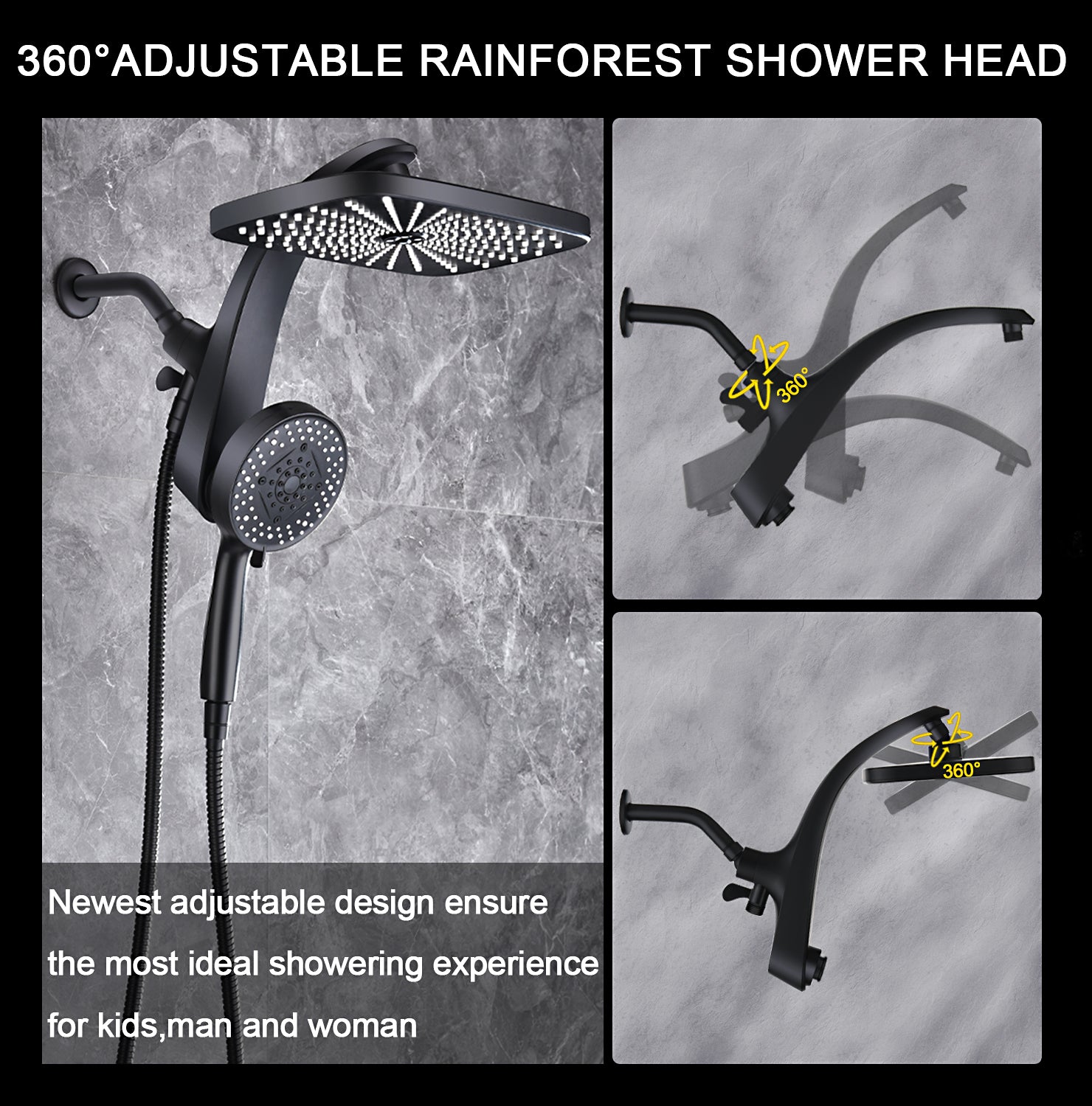 • Patented dual shower head, switch black knob of shower bracket, you can change water flow from fixed rainfall shower head to handheld shower head or both of them. This special design can bring more convenient to you enjoy showering time at the same time of saving water (Patent NO: US0D1058748S)