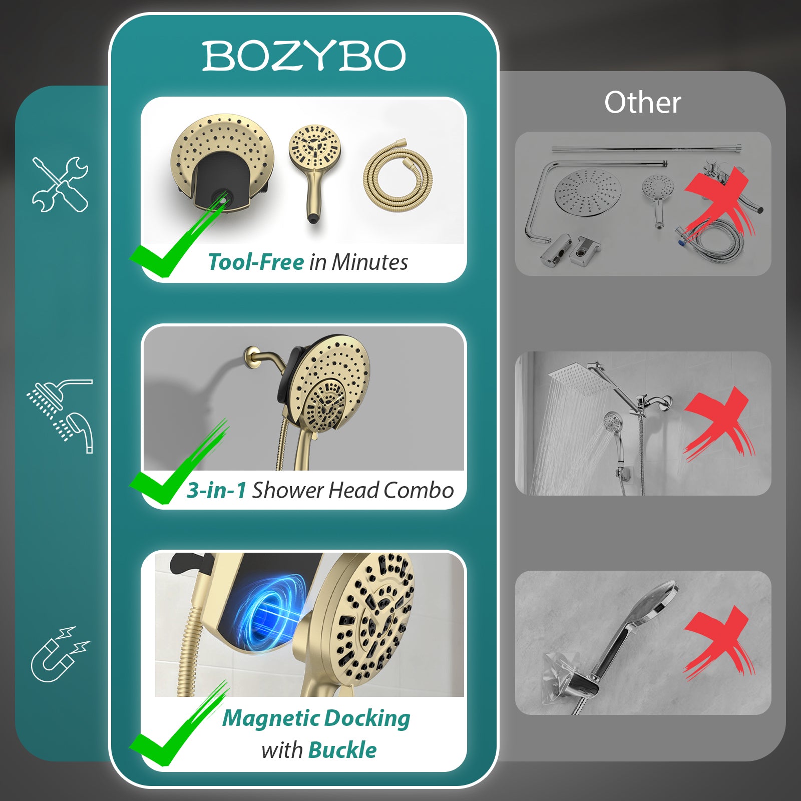 - BOZYBO Upgrade Magnetic Shower Head – Crafted after millions of tests, this shower heads with handheld spray combo features dual-secure magnetic + buckle design for firm hold, with an optional extra magnetic holder to suit kids and those with limited mobility, blending convenience and safety ( Magnetic Holder: B0FH1BYGSH)