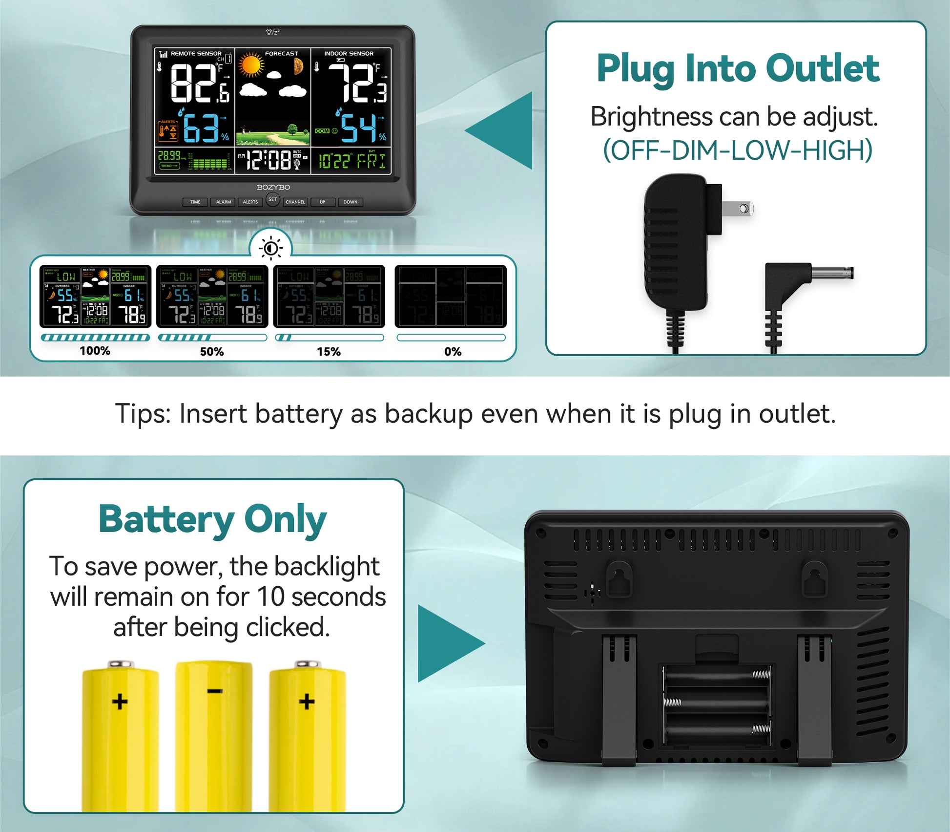 - Atomic Clock with Adjustable Backlight: When plugged in to a DC adapter, the monitor brightness can be adjusted to three different brightness levels ( High Bright - Low Bright -Dim - Off ). When powered by a battery, the backlight will turn off after 10 seconds to save power.