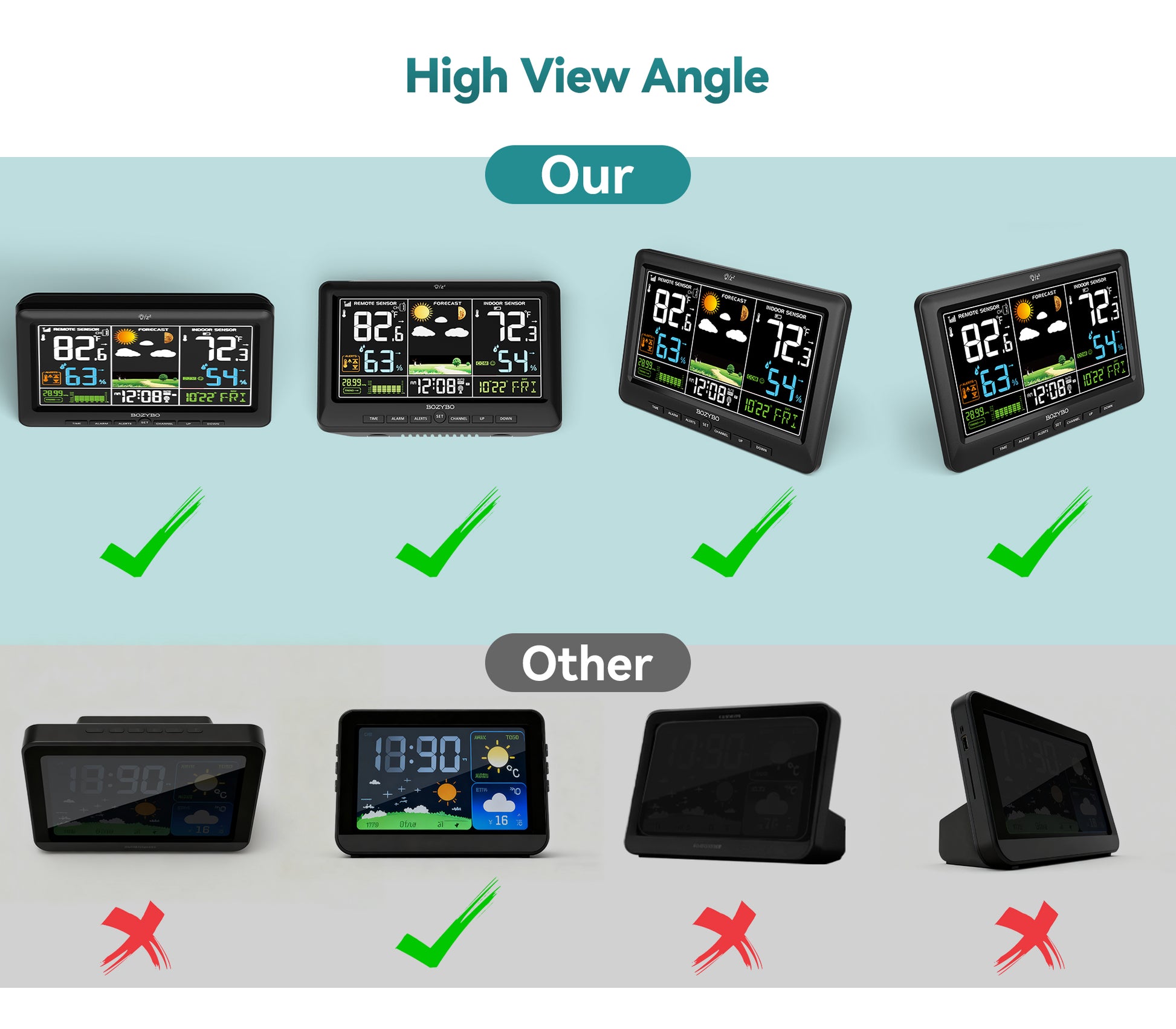 - 7.5" Colorful Weather Station: Equipped with 7.5" HD full color screen visible from any angle. Perfect for placing on a desk or hanging on a wall. Extensive information displayed by this digital hygrometer includes: indoor/outdoor temp and humidity, air pressure and history, moon phase, calendar, atomic clock, weather forecast and trend, Hl/LO ttemperature & humidity alerts and more.